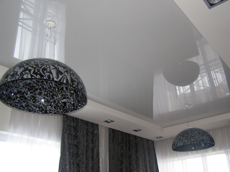 Глянцевый потолок - отличное решение для гостиной, обладает прекрасной отражающей гладкой поверхностью, увеличивает пространство комнаты, придает веселое настроение помещению.